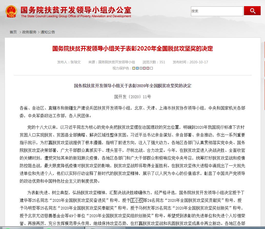 关于表彰2020年全国脱贫攻坚奖的决定