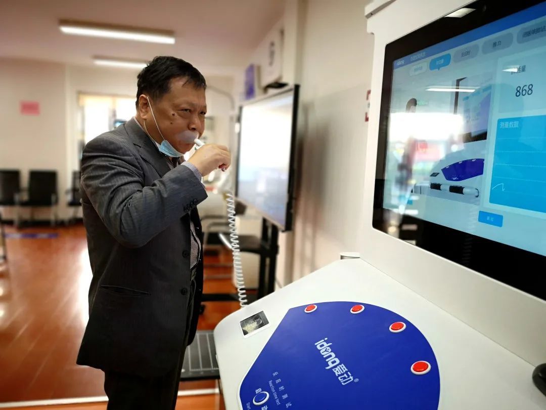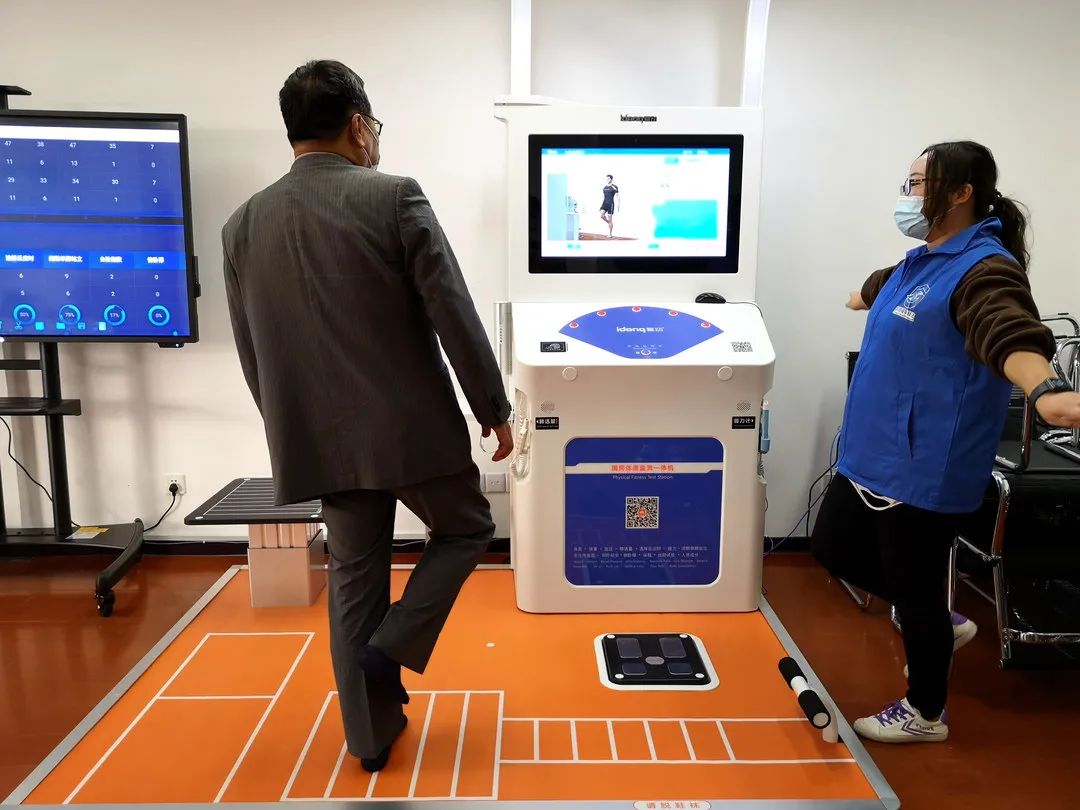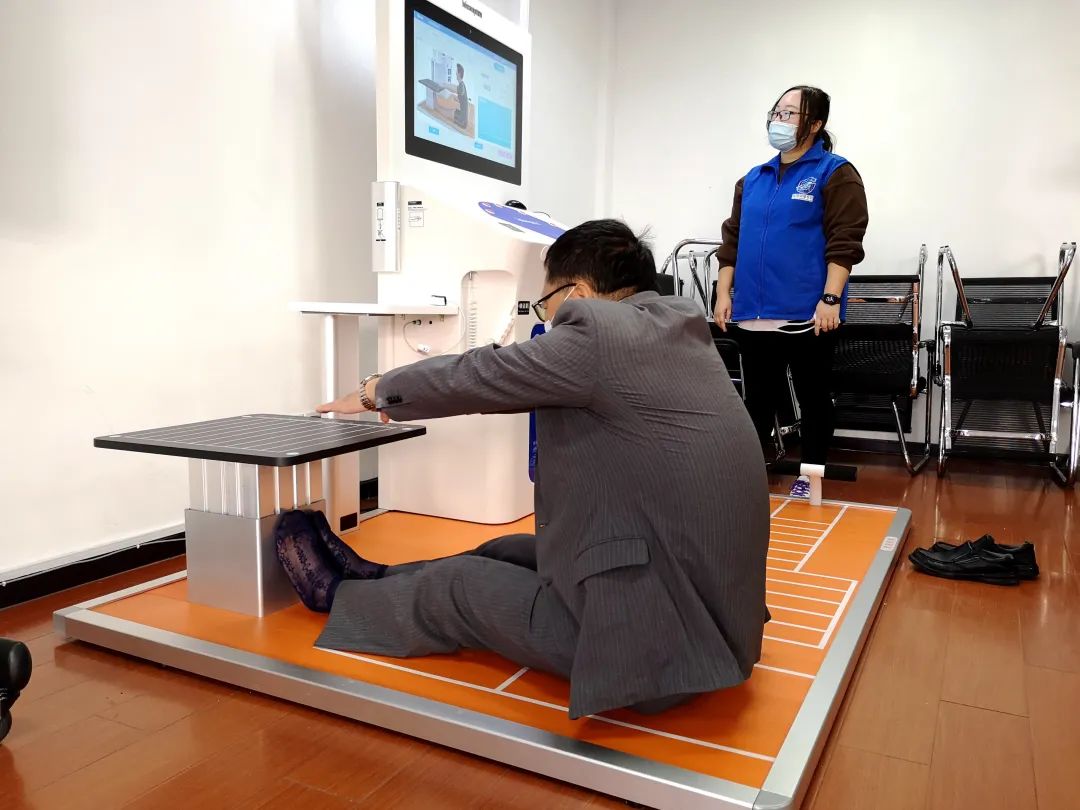 接下来,唐强华又在国民体质监测一体机上进行了体质检测,根据他的年龄、性别,一体机为他安排了肺活量、反应时、握力、闭眼单脚站立、坐位体前屈等检测项目。