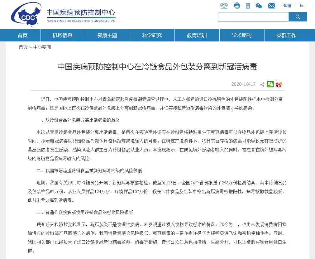 中国疾控中心:青岛冷链食品外包装分离出新冠活病毒