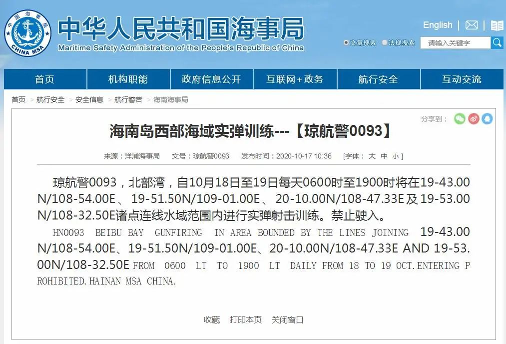 据中国海事局网站10月17日消息,海南岛西部部分海域10月18日至19日每天6时至19时进行实弹射击训练,禁止驶入。