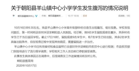 据辽宁省朝阳县融媒体中心微博消息,辽宁省朝阳县教育局10月17日通报:10月16日早6:30左右,我县羊山镇中心小学高年级部69名住宿生出现腹泻、呕吐现象。学校发现问题后,第一时间将这些同学送至朝阳县人民医院。经诊断,除9名学生留院观察处置外,其余60名学生已于当日返回学校。截止17日16时,留院观察9名学生中,有7名学生已经出院,其余2名学生具备出院条件,但在检查过程中发现其他病症,需要留院进一步治疗。