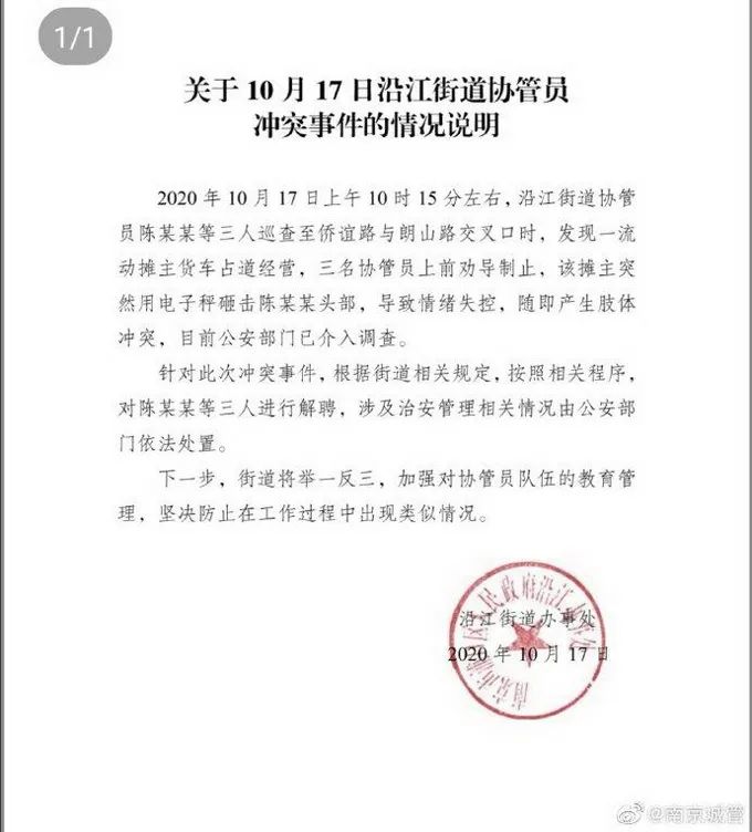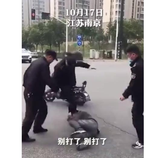 10月17日,网上热传两段视频,视频中三名身穿制服的男子正在殴打一名身穿牛仔衣的男子。据现代快报报道,三名男子是南京市江北新区沿江街道的协管员,被打者是一名流动摊贩。