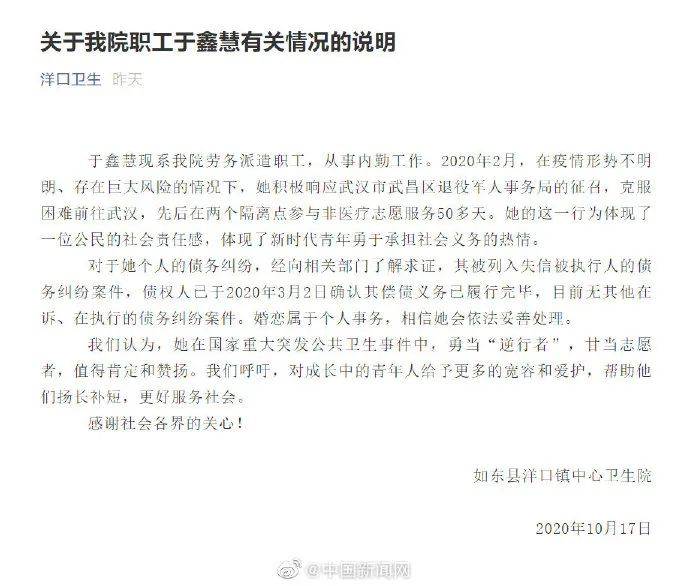 江苏省南通市如东县洋口镇中心卫生院公众号17日晚发布《关于我院职工于鑫慧有关情况的说明》:①于鑫慧现系该院劳务派遣职工;②今年2月,疫情情况尚不明朗时,于鑫慧积极响应征召前往武汉,先后在两个隔离点参与非医疗志愿服务50多天;③其被列入失信被执行人的债务纠纷案件,其偿债义务已履行完毕,目前无其他在诉、在执行的债务纠纷案件;④婚恋属于个人事务,相信她会依法妥善处理;⑤于鑫慧勇当“逆行者”,甘当志愿者,值得肯定和赞扬。呼吁对成长中的青年人给予更多的宽容和爱护,帮助他们扬长补短,更好服务社会。