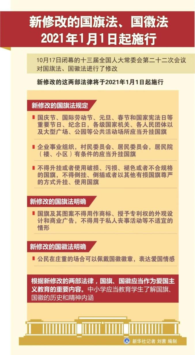 此外,新法还增加国旗、国徽适用场合。例如,增加规定中央人民政府驻香港、澳门特别行政区有关机构应当在工作日升挂国旗、悬挂国徽。
