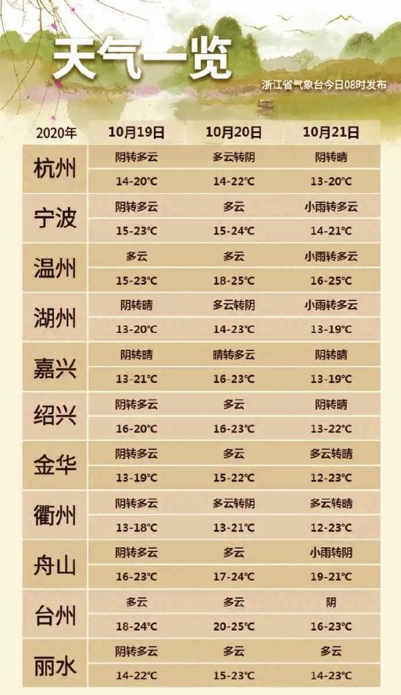 10月21日:浙北和沿海地区阴,部分地区偶有小雨转阴到多云,其他地区多云。