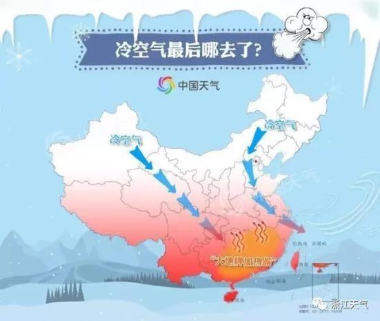 当冷空气南下抵达我国时,我国的地面温度要高于冷空气的温度,且纬度越低、地面温度越高。其实,地面就如同一台加热器,和冷空气不断进行热量交换,使其温度不断升高,降温能力越来越差,最终失去冷空气的特征。