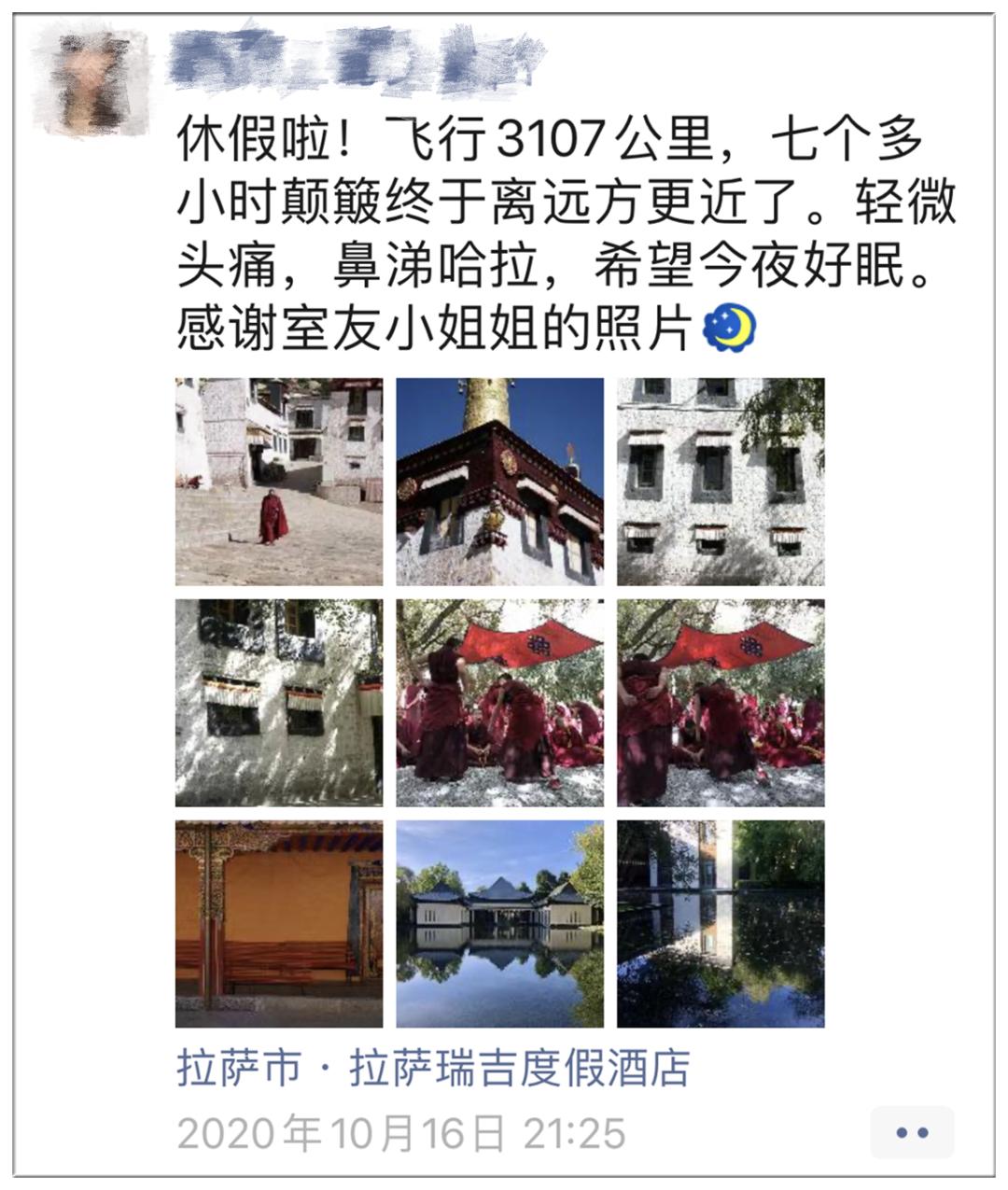 “休假啦,飞行3107公里,7个多小时颠簸终于离远方更近了,赶上了西藏的绝美秋色。“小冉10月16日发了朋友圈,错峰出行抵达拉萨,开始了自己的西藏之旅。
