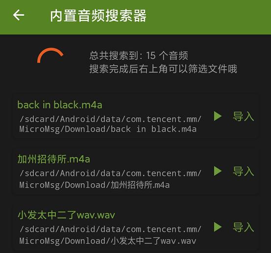 想要导入自己剪辑好的音频自然也是可以滴,软件自带的 “ 导入音频 ” 程序会搜索手机上的所有音频文件,差友们选择合适的文件点击导入即可。