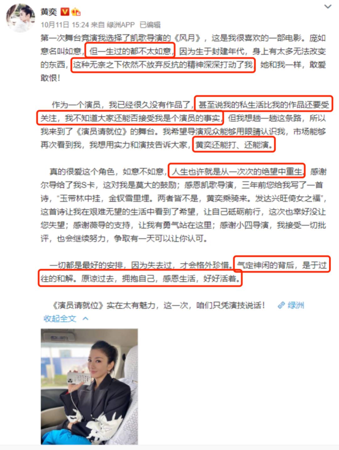 《演员请就位2》播出后,黄奕在微博写了一篇小作文,就像是对上一段糜烂婚姻的总结,她说: