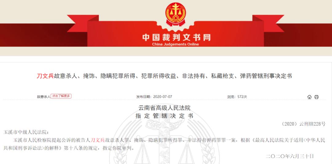 近日,网传马加爵案的主审法官涉嫌故意杀人罪。一份(2020)云刑辖228号“云南省高级人民法院指定管辖决定书”显示,玉溪市人民检察院提起公诉的被告人刀文兵故意杀人罪、掩饰、隐瞒犯罪所得罪、非法持有弹药罪一案,根据《最高人民法院关于适用