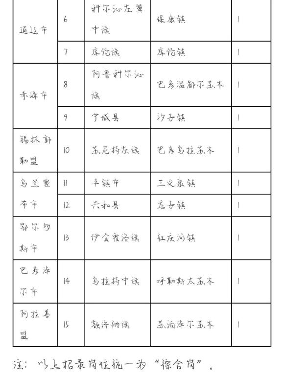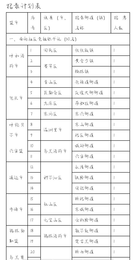 本次考录工作采取定岗方式进行。嘎查村、社区党组织书记分类报考所在盟市的苏木乡镇、街道相应职位,不得跨盟市、跨类别报考。具体《招录计划表》附后。