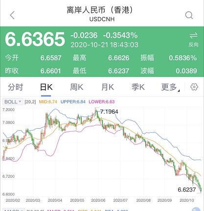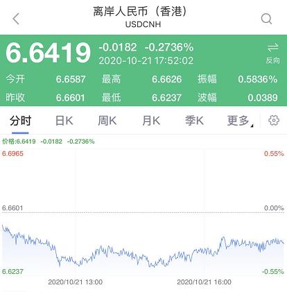 10月21日,人民币汇率在离岸市场和在岸市场双双创出新高。截至发稿,在岸人民币对美元最高触及6.6413,离岸人民币对美元最高触及6.6237,创下2018年7月以来新高。
