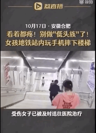 一个年轻女孩正举着手机玩得起劲,突然脚下踩空。