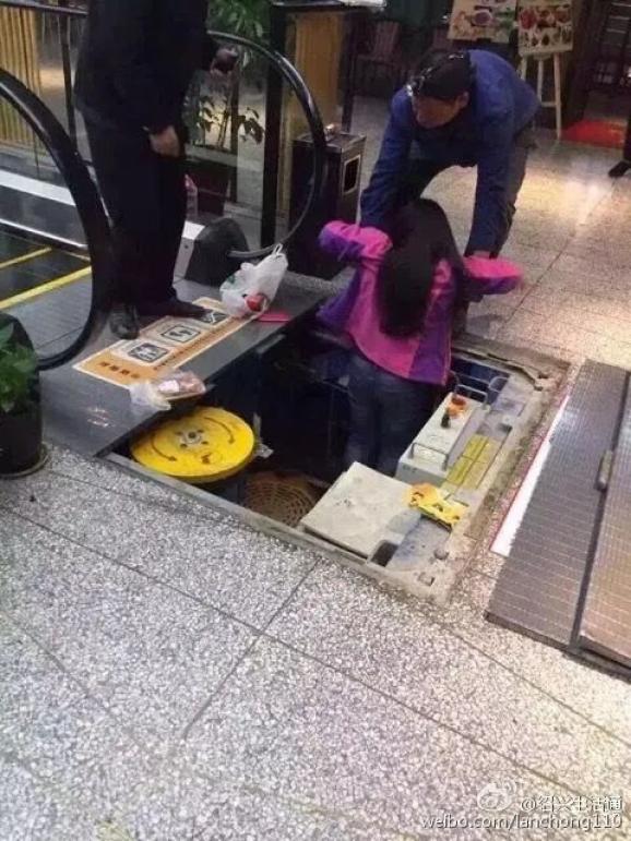 一个姑娘“砰”的一声掉进了正在维修的电梯井里。
