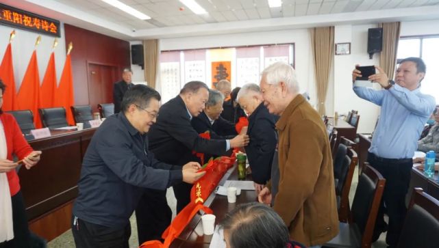 会议室两边悬挂的由郑州诗词两会老同志创作的20余幅祝寿诗词及画作。祝寿诗会开始后,与会领导为8位年满80岁的老寿星佩戴红花,赠送纪念品。