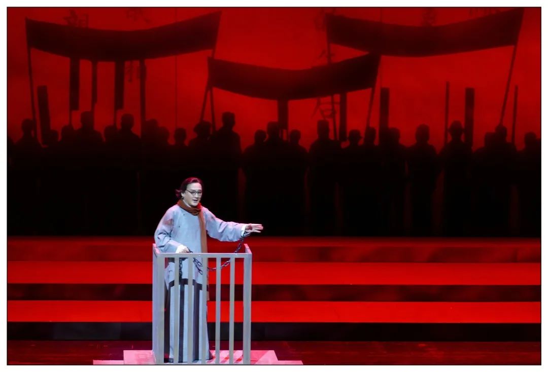 而舞台呈现自然是需要在特定的舞台空间里展开。反映在舞台上,《早春》的语汇用“灰”作为主基调,用“红”代表革命,用“蓝”象征时代背景,在写实的基础上建立虚化时空的距离感。为了表达出柔石作为一个作家的特殊气质,该剧设计师桑琦还特意引进了一个纱幕元素,用一道带有漫天乌云笼罩的灰色纱,隔开现实与精神世界。“这道纱被刻意设计在舞台中区,在其背后设置了柔石所写的作品名称,在剧情推动中,用逆光打亮文字吊景,使得文字的影子零星撒在纱上。这种手法在景云里凌乱无序的电线影子,在柔石被审判独白时出现游行队伍的影子等其他场景中同样被加以运用,有助于营造出诗意且独一的柔石空间”