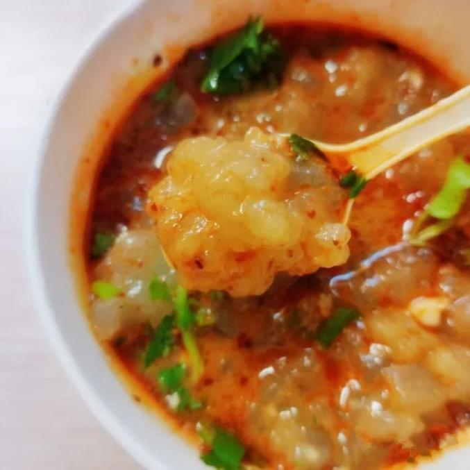 店门口一大锅热气腾腾的炒粉不断被搅拌着,大块的炒粉淋上香浓的麻酱,再根据自己的口味加入调料,滑嫩爽口的炒粉配上香气浓郁的芝麻酱,每一口都特别香。