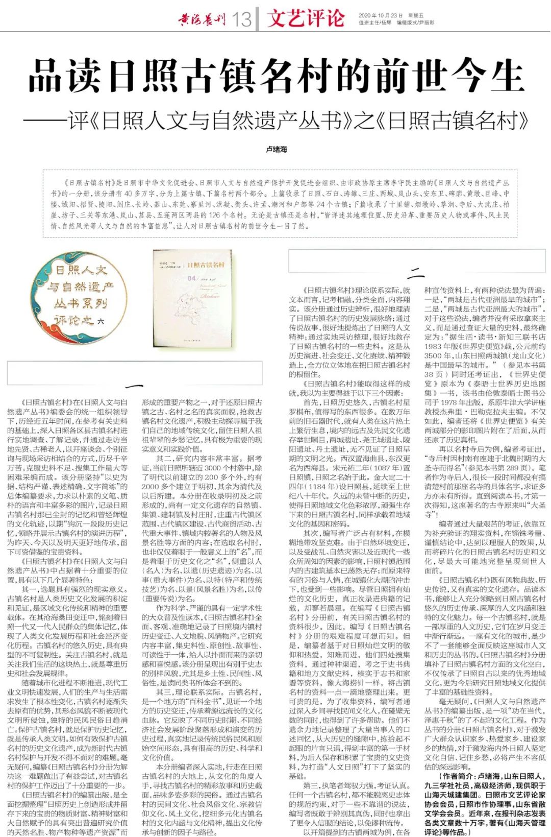《日照古镇名村》理论联系实际,就文本而言,记考相融,分类全面,内容翔实。该分册通过历史辨析,很好地理清了日照古镇名村的历史发展脉络;通过传说故事,很好地提炼出了日照的人文精神;通过实地采访整理,很好地救存了日照古镇名村的一些史料。这是从历史演进、社会变迁、文化赓续、精神锻造上,全方位立体地在把日照古镇名村的根留住。