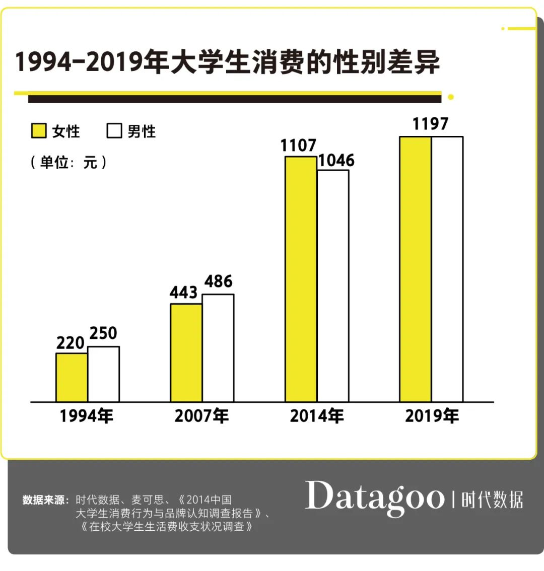 在 1994 年到 2014 年的 20 年间,男女大学生的消费水平一直区别不大,并趋于一致。1994 年,男女生消费分别为 250 元和 220 元,到 2007 年是 486 元和 443 元,2014 年则为 1046 元和 1107 元。