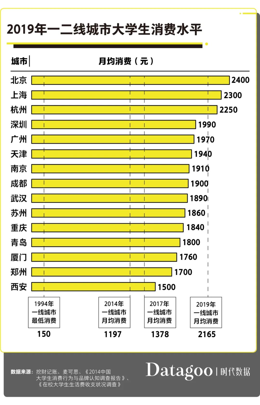 根据挖财记账《 2019 大学生消费报告》数据,北上广深大学生月均消费分别是 2400 元、2300 元、1970 元和 1990 元。并且,作为二线城市的杭州,其消费水平已经达到一线水准。