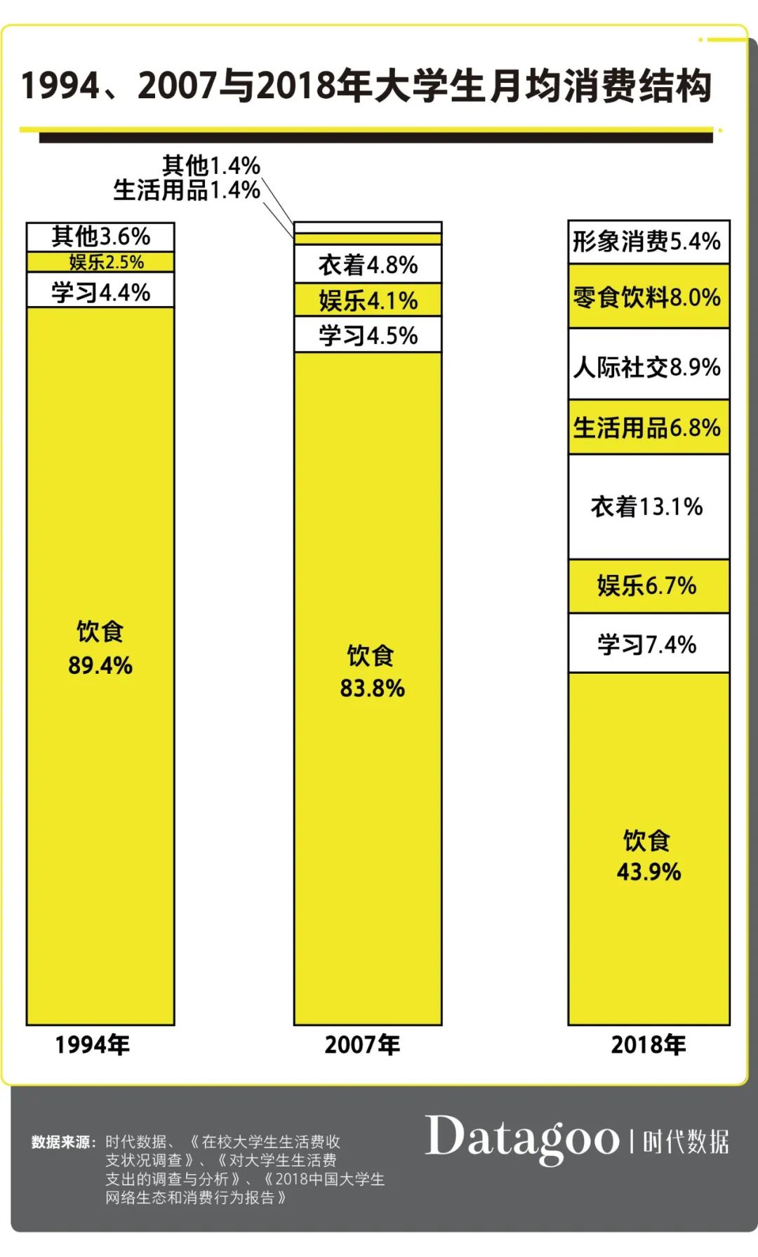 但 2007 年后的十年间,社会生活变化显著。2018 年,大学生的支出结构已经发生本质性的变化:饮食支出不再一家独大,只占 43.9% ,与娱乐、着装、形象及社交等支出各占半壁江山。