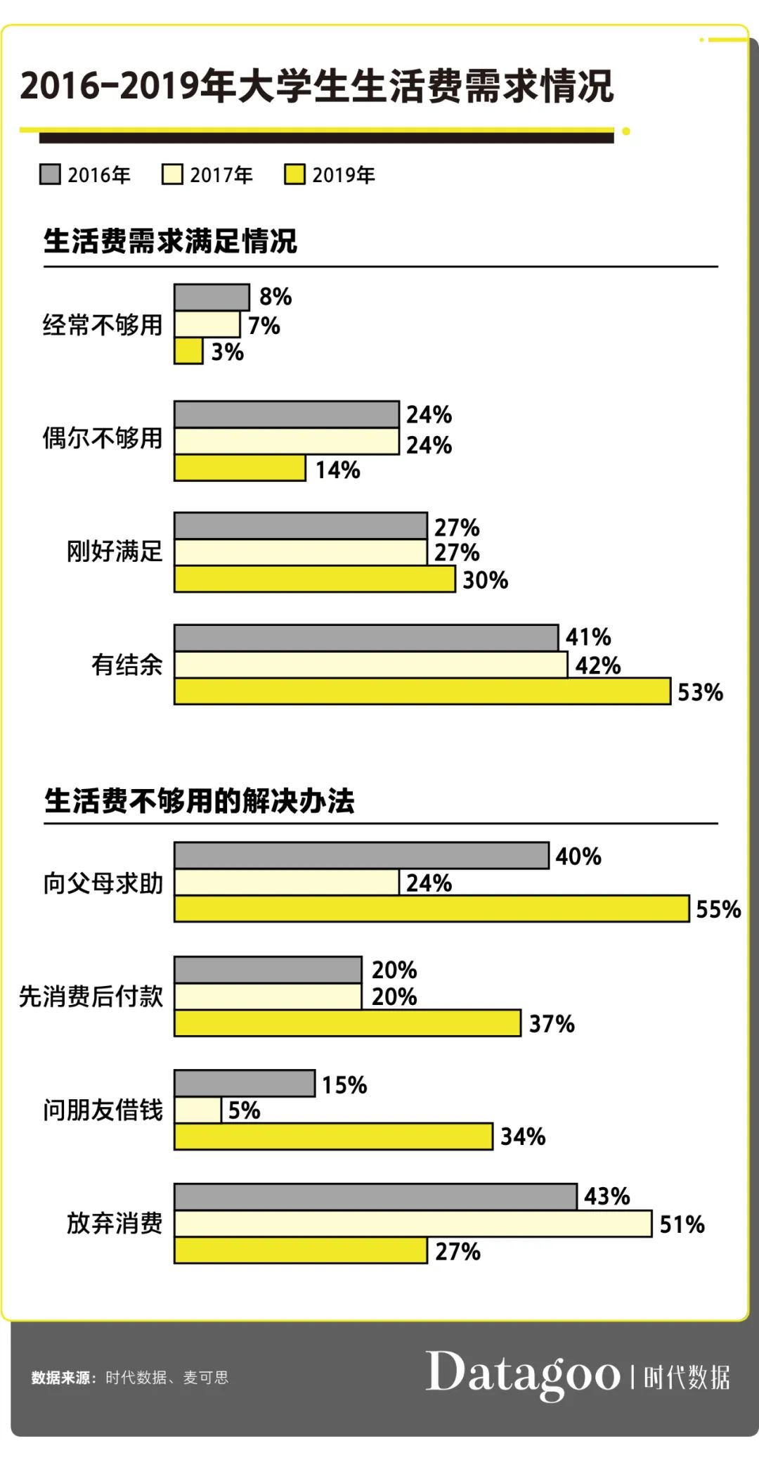 不过,2019 年 55% 的学生没钱时仍会选择直接找父母帮忙,这依然是最重要也最有效的方法。但是在讨要生活费的时候,我们至少应该权衡自己生活水平与父母负担之间的消长。