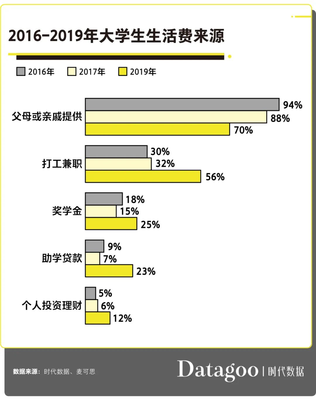 据麦可思调研发现,从 2016 年到 2019 年,不跟父母亲戚要钱的大学生从 6% 上涨到 30% ,努力打工兼职的人数占比也从 30% 跃升至 56% 。