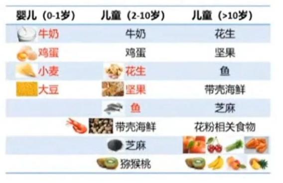2-10岁:牛奶、鸡蛋、花生、坚果、鱼、带壳海鲜、芝麻、猕猴桃;