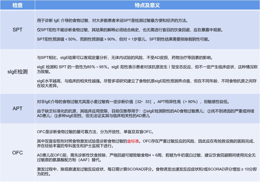 除病史询问外,辅助检查(SPT、sIgE、APT等)也有助于判断AD相关食物过敏。不同检查方式对诊断的参考意义不同(如下表)。