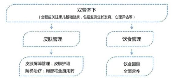 郭一峰教授指出,AD相关食物过敏应该以全程关注患儿基础健康、双管齐下(皮肤管理+饮食管理)管理作为指导原则。
