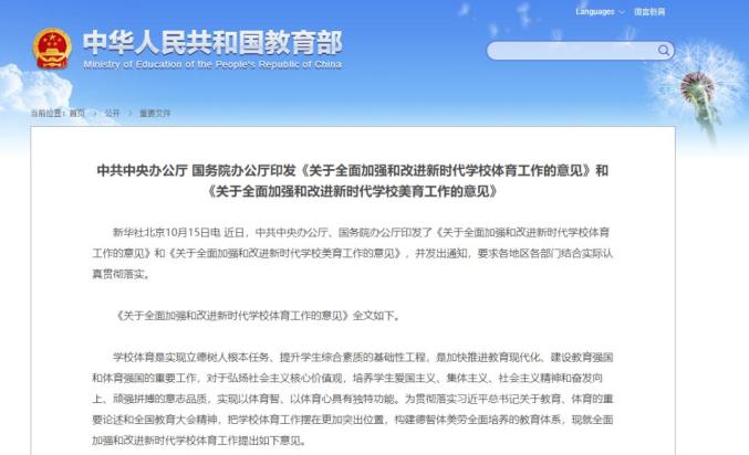 不久前,中共中央办公厅、国务院办公厅印发了《关于全面加强和改进新时代学校体育工作的意见》和《关于全面加强和改进新时代学校美育工作的意见》。