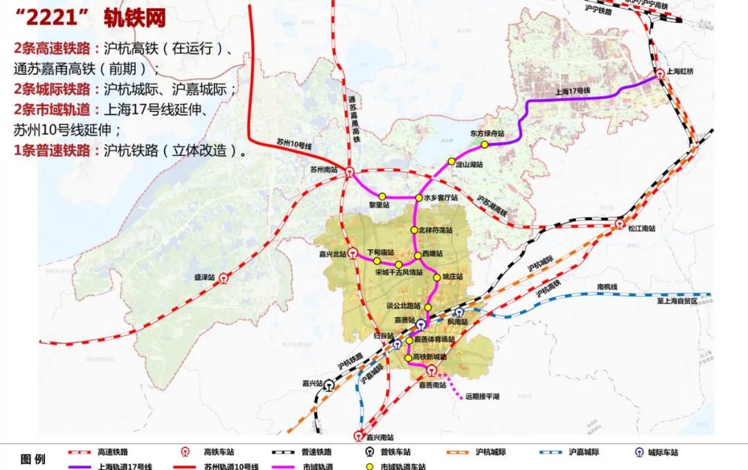 相比苏州,嘉兴和上海的交通对接相对滞后,但是也不是没有好消息。近期公布的长三角生态绿色一体化发展示范区嘉善片区综合交通规划(公示稿)提到,要在嘉善构建“2221”轨铁网,包括沪杭高铁、通苏嘉甬高铁,沪杭城际、沪嘉城际,上海17号线延伸线、苏州10号线延伸线以及沪杭铁路。