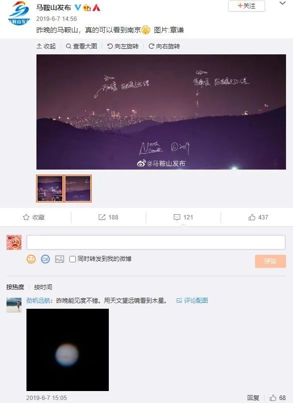 马鞍山市委宣传部去年曾发布这样一条微博,“昨晚的马鞍山,真的可以看到南京”。文字配图是一张夜景图,可依稀看到远处的南京地标建筑紫峰大厦,@马鞍山发布称,这张图片拍摄于马鞍山市中心某小区楼顶……