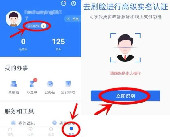 登录后点击APP页面右下方底部“我的”,点击头像右边的“去实名认证”,进入实名认证页面。实名认证后即可办理业务。