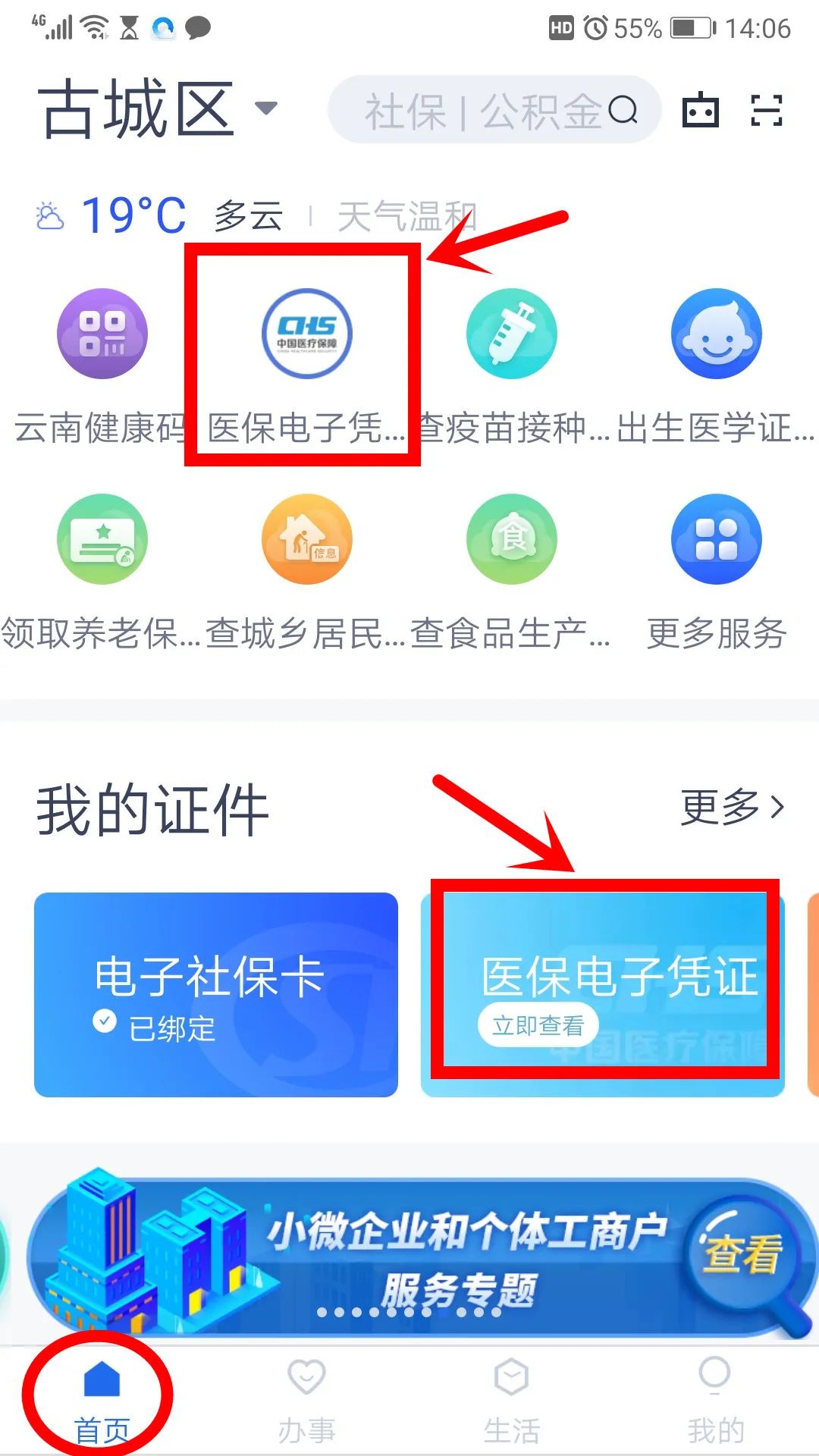 1.在“办事通”首页点击“医保电子凭证”图标或者在下端“我的证件”处点击“医保电子凭证”。
