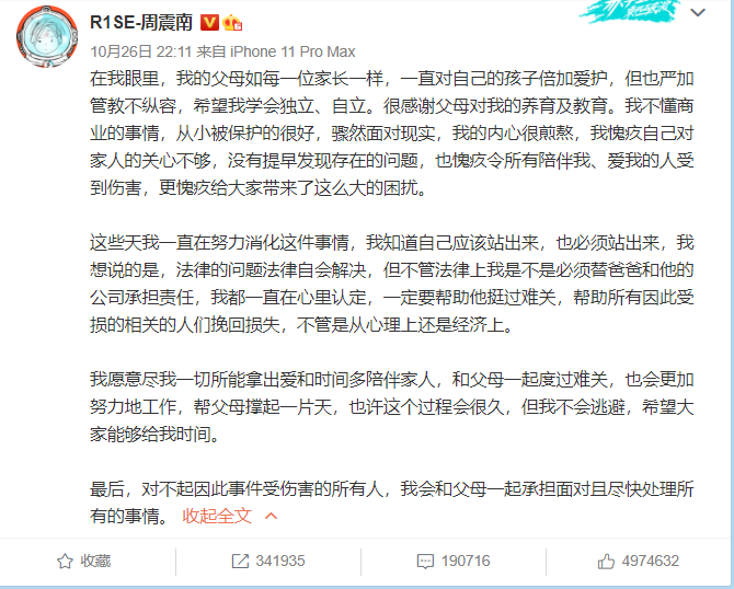 10月26日晚,周震南终于发声,直言自己骤然面对现实,内心非常煎熬,愧疚对家人关心不够,没有提早发现存在的问题,并表示将帮助父母挺过难关。