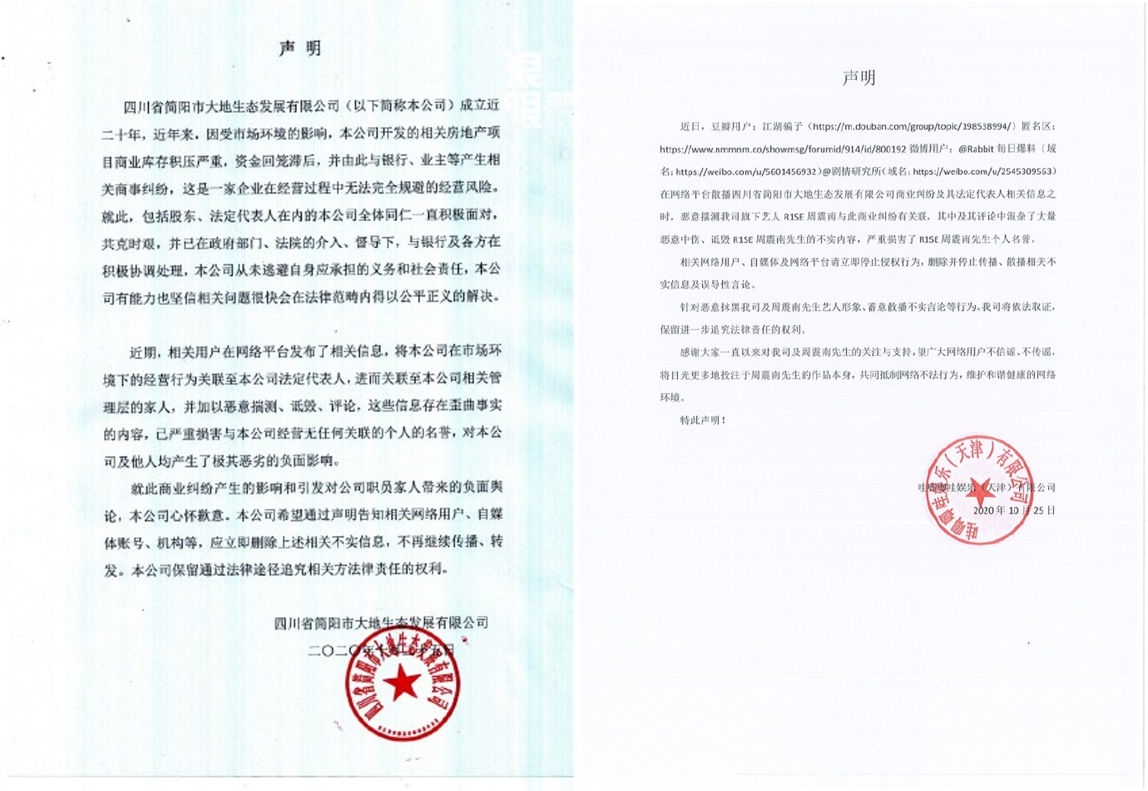 10月25日,周震南父亲的公司和周震南的经纪公司哇唧唧哇迅速发声明进行回应。前者称已在与各方积极协调处理,后者则表示相关网友散播信息时,恶意揣测旗下艺人周震南与此商业纠纷有关联,将依法取证保留进一步追究法律责任的权利。