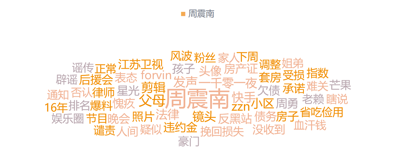 彼时,虽然娱理报道称,有律师表示周震南不应承担父母的债务,但沸腾的舆论对于周震南的失声并不满意。微热点数据显示,在周震南相关词云中,“老赖”、“受损”、“谴责”等负面意味词语成为了高频词。