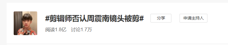 综艺方面,有消息传出周震南参加的《姐姐们的爱乐之城》正在火速剪辑掉他的镜头,随后有相关方面人员下场辟谣,#剪辑师否认周震南镜头被剪#也很快登上热搜。