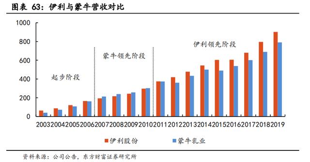 复盘伊利的成长路径,以营收规模为基准,以竞友蒙牛为参照对象,主要经历了三个时期:起步、落后、领先。