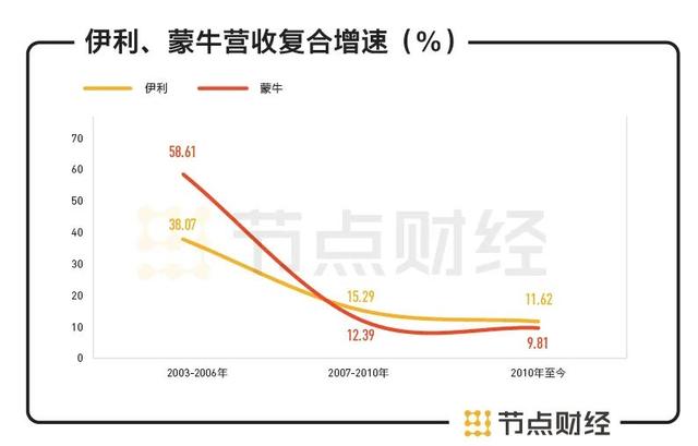 2003-2006年,蒙牛初创,伊利起初规模领先,但蒙牛营收复合增速更高,达到58.61%,很快就追平了伊利。