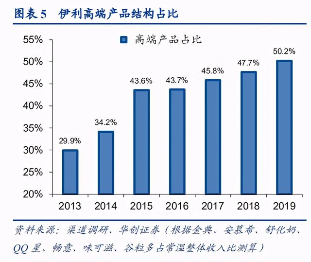 按照品牌划分,截至2019年,伊利共拥有安慕希和伊利纯牛奶2款200亿级大单品,10亿级以上单品多达十余只。其中,安慕希、金典等高端产品已成为近年来拉动伊利营收的主力引擎。