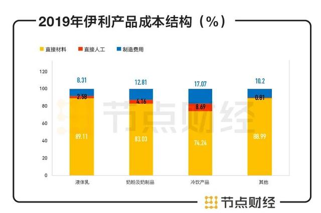 成本构成上,乳制品以生鲜乳、糖、乳清粉、脱脂奶粉等直接材料成本为主,加工成本、制造费用占比较小。2019 年,伊利液体乳、奶粉及奶制品、冷饮产品直接材料成本占比分别为 89.11%、83.03%、74.24%,2018年为89.29%、81.43%、74.4%,相差不大。