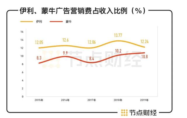 销售费用构成中,广告营销费是大头,伊利整体占比高于蒙牛。2019年,二者花在广告营销上的费用分别为110.4亿元和85亿元,占营业收入比例为12.24%和10.8%;从趋势上看,伊利在广告营销上投入稳定,费用投入把控适当,蒙牛呈上升态势。