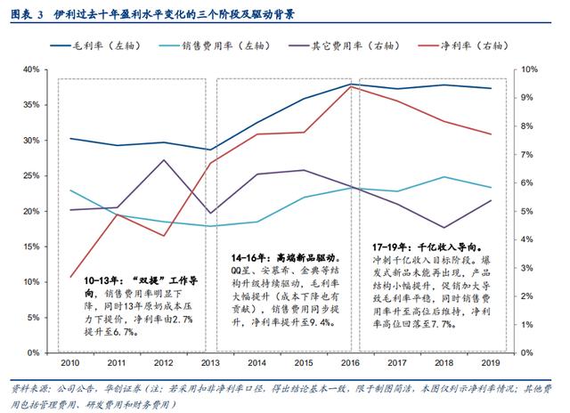 2017-2019 年:千亿收入目标导向下,买赠促销力度加大,毛利率高位平稳,净利率回落,2019年为7.7%。