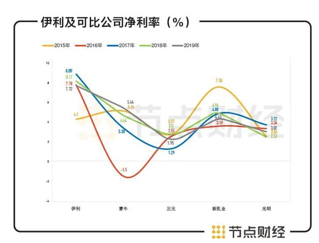 2015-2019年,伊利毛利率位于33%-39%区间,净利率位于7%-10%区间。拉长维度看,2010年至2019年,伊利的净利率走势有以下几个变化。