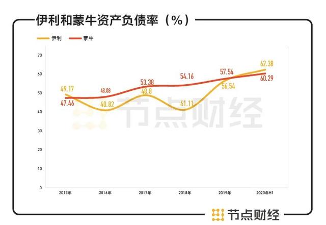 由于2019年发债的缘故,截至2020年6月末,公司资产负债率达到62.38%。从变动曲线来看,伊利呈波动上涨,蒙牛较为平滑。
