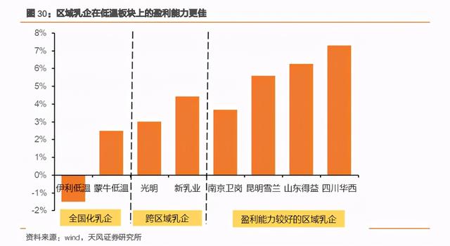 另外,基于巴氏奶的特点,区域乳企因为在奶源、营销上的优势往往握有先机,盈利能力也更佳,如南京的卫岗、广州的风行、深圳的晨光、苏州的双喜、郑州的花花牛等等。根据估算,区域乳企自有牧场供奶占比多在40%以上,低温奶收入占比也多数高达40%以上,而伊利的低温奶收入占比均不超过20%。