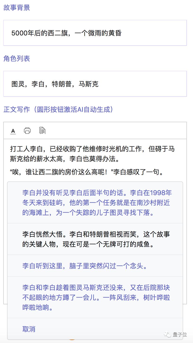 每次AI会给出根据设定的背景和角色生成的4段简短的语句,作家可以选择其中一段,也可以重新生成。