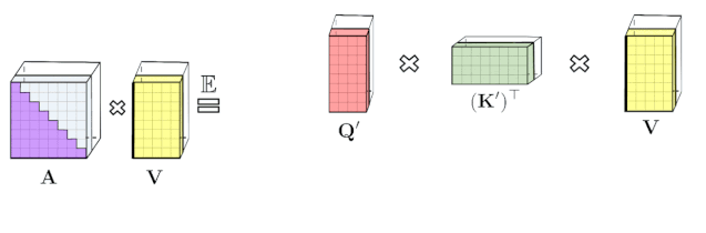 上文描述的分解允许我们以线性而非二次内存复杂度的方式存储隐式注意力矩阵。我们还可以通过分解获得一个线性时间注意力机制。虽然在分解注意力矩阵之后,原始注意力机制与具有值输入的存储注意力矩阵相乘以获得最终结果,我们可以重新排列矩阵乘法以近似常规注意力机制的结果,并且不需要显式地构建二次方大小的注意力矩阵。最终生成了新算法 FAVOR+。